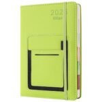 Agenda accademica 2026, A5, pagina al giorno, dal gennaio 2026 al dicembre 2026, con linguetta mensile colorata, tasca anteriore/interna, chiusura elastica verde