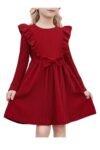 Arshiner Ragazze Abito Foglia di Loto Manica Bambini Casual Papillon Linea A Festivo Autunno Inverno Maniche Lunghe Abito per Bambine 6-7 Anni Rosso Scuro