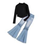 Asbabiy Girl’s 2 piece outfit Rib Knit long sleeve top Sweater and Bow Front Flared Leg Jeans Pants Set for 7-13 Years (Black,8-9Y(51-54 IN))