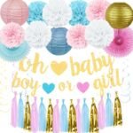 - Baby Gender Reveal Decoration: This baby gender reveal decoration kit include 1pcs paper banner”Oh Baby, Boy or Girl”, 9pcs blue and pink tissue paper pom poms, 3pcs paper lanterns, 1pc pink blue gold tassel garland, 6pcs blue pink hanging swirls.
