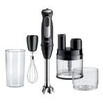 • Accessori: asta di miscelazione in metallo, mini processore alimentare, tritatutto SizeControl, disco da taglio/raspa, frusta in metallo e un coltello Ice Crush; il bicchiere di plastica da 600 ml è privo di BPA e ha segni di misurazione ml e fl oz