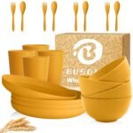 BUSOKIP Wheat Straw Plates and Bowls Sets 20 Piece, Unbreakable Kids Dinnerware Sets for 4, Microwavable Plates, Bowls, Cups Set, Reusable Plastic Dishes Set for Camping, Kitchen, College (Yellow)