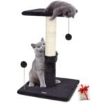 Happi N Pets 26″ Cat Scratching Post with Platform, Sisal Cat Trees Tower for Indoor Cats, Featuring with Hanging Balls & Cozy Cat Perch, Stable Cat Scratch Posts for Kittens-Smoky Gray