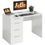 HOMCOM Scrivania Salvaspazio, 110×61.5×75 cm Scrivania Moderna con 4 Cassetti, Tavolo Computer per Casa, Studio, Camera e Ufficio, Bianco Lucido