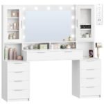 - [Ampio spazio di archiviazione] Questa postazione trucco offre ampio spazio di archiviazione con doppi armadietti nella parte superiore. Il ripiano sinistro è regolabile, mentre sul lato destro sono presenti un vano portaanelli e un gancio per collane, che evitano l’aggrovigliamento dei gioielli. 2 scomparti aperti al centro garantiscono un facile accesso a cosmetici e prodotti per la cura della pelle di uso frequente. 2 ampi cassetti e otto piccoli cassetti nella parte inferiore consentono di riporre in modo ordinato gli accessori, mantenendo il piano sempre pulito e organizzato