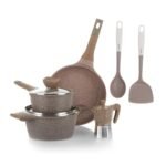 - SET PENTOLE da 8 pezzi: 1 padella, 2 pentole con coperchi, 2 utensili, 1 caffettiera da 2 tazze (non adatta all’induzione)