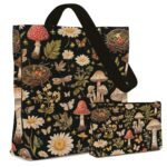 LARIAU Botanical Garden Canvas Tote Bag with Makeup Pouch, Mushroom and Floral Pattern, Black Mushroom Canvas Tote Bag for Gym, Travel, Work, Birthday Gifts for Women Girls