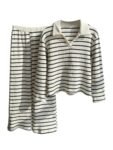 MakeMeChic Girl’s 2 Piece Outfits Striped V Neck Long Sleeve Tops and Wide Leg Pants Set Black and White 12Y