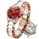 OLEVS Watch Women Red Watches for Women Rose Gold Ladies Automatic Watch Red Face Mechanical Womens Watches with Date Self Winding Elegant Waterproof Ceramic Dress Women’s Wristwatch with Heart Reloj de Mujer