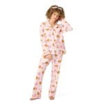 - Women’s flannel PJ set in pink-and-white stripe with heart-shaped waffles, croissants, latte cups, and strawberries. Includes piped top, straight-leg pants with tie waist, and matching headband