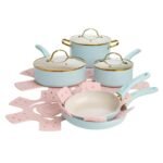 Paris Hilton Epic Nonstick Pots and Pans Set, Multi-layer Nonstick Coating, Tempered Glass Lids, Soft Touch, Stay Cool Handles, Made without PFOA, Dishwasher Safe Cookware Set, 12-Piece, Aqua is available on Amazon at best discounted online price. Original price of this product is $ 99.99000000000001. You can buy this product at discounted rate $ 50.