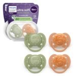 Philips Avent Ultra Soft Ciuccio – Design ortodontico, per neonati 0-18 mesi, scudo flessibile, tettarella simmetrica extra rigida in morbido silicone, senza BPA, confezione da 4, SCF093/07