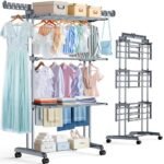 PurKeep Stendino a 4 Ripiani, Grande Capacità – Upgrade Stendino Con Ruote, Stendibiancheria Pieghevole a Torre in Acciaio Inox, Stabile Verticale per Interni/Esterni, Salvaspazio, Grigionero