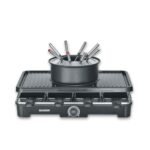 - COMBINAZIONE RACLETTE E FONDUTA: un unico apparecchio che combina la funzione raclette e la funzione fonduta; permette di grigliare sulla piastra superiore, gratinare nelle padelline e preparare fonduta di formaggio o cioccolato contemporaneamente