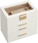 SONGMICS GISELLA Collezione – Scatola Portagioie con Coperchio in Vetro, 4 Livelli, Porta Gioielli con 3 Cassetti, Moderno, Idea Regalo, Bianco Nuvola e Dorato, 15,3 x 25,1 x 21,5 cm JBC161W01 is available on Amazon at best discounted online price. Original price of this product is € 45.99. You can buy this product at discounted rate € 29.99.