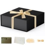 • 🎁【Classic Design & Multiple Uses in One Box】This black gift box for presents measures 7.5″x7.2″x2.8″, offering ample space for gifts items. Each set is a complete gift wrapping, including: 1 gift box, 1 gift card, a 61.5″ champagne colored ribbon, and 15g paper filler, ready to use right out of the box, saving time and effort for gift giving.
