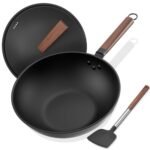 - VERTICAL LID: The vertical lid design is more suitable for comfortable grip. You can make it “stand up” instead of lying on the countertop. Besides, Our Asian Cookware wok set also contains a silicone spatula.