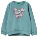 - Felpa chiusa con costina su collo, polsi e fondo. Grafica stampa più ricamo di petali. Regular fit.