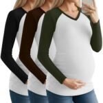 • Comfortable Design: maternity long sleeve shirt features a v neck, raglan sleeves, side pleats, ribbed knit and contrasting colors; The side ruched are designed to fit the raised belly and display curves, providing ample space for a growing belly