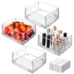 VINATO Set Da 4 Organizer Frigorifero, Contenitori Frigo Trasparenti, Impilabile, Senza BPA – Organizer Cucina, Organizer Bagno- Per Alimenti, Cosmetici E Articoli Da Ufficio