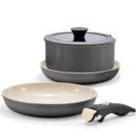 - [Complete set ] : 8″ Frying pan with lid (lid also fits 2.5Qt saucepan), 10″ Frying pan, 2.5QT Saucepan, one detachable handle.