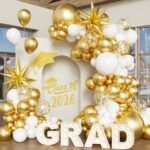 - Package Includes: 130 pcs graduation balloon arch kit includes 2pc 22″ foil stars balloons, 10pcs 12″ gold confetti balloon, 3pcs 18″ gold/white balloons, 35pcs 12″ gold/white balloons, 50pcs 10″ gold/white balloons, 30pcs 5″ gold/white balloons, 1pc ribbon, balloon strip and 5pcs glue dots