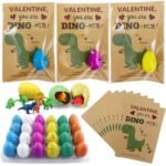 • Package includes 24 cards with 24 colorful eggs. Dino toys let your kid give more than a card.