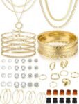 YEEZII 56 Pcs Gold Jewelry Sets for Women with 5Pcs Layered Necklace, 5Pcs Layered Necklace, 12 Bracelets, 4 Hoop Earrings, 8 Stackable Rings, 10 hairpins, 12 Studs Earrings Jewerly set for Women is available on Amazon at best discounted online price. Original price of this product is $ NaN. You can buy this product at discounted rate $ 12.99.